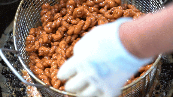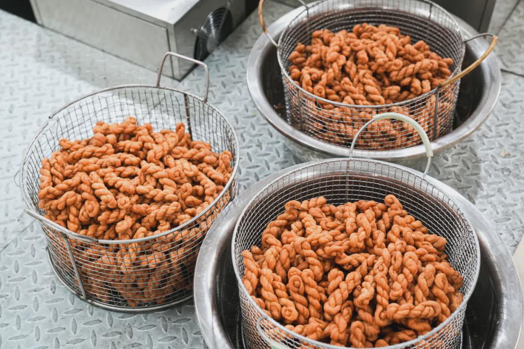 另一边呢,麻花早已炸至壳脆里酥地候着了。