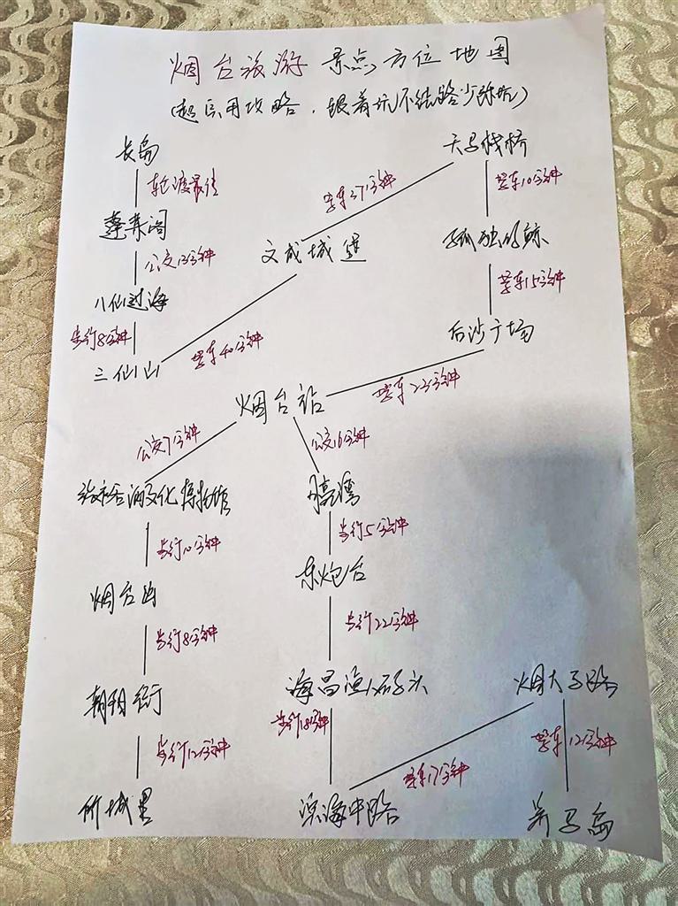 为了提供准确的信息,孙飞利用休息时间查阅烟台旅游资料,向车上的烟台居民请教,自己手绘了一份“烟台旅游攻略图”,标注了热门景点、特色美食和交通建议。此后,每当在车厢里遇到前往烟台旅游的旅客,她都会主动分享这份攻略,帮旅客规划行程。