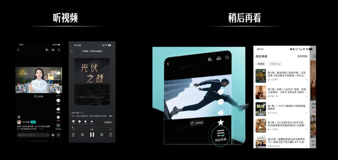 开车、做饭不方便看视频的场景也不能阻挡学习的脚步,抖音精选的“听视频”功能将视频内容转化为音频形态,开着后台就能听,省流省电,比播客还好用。