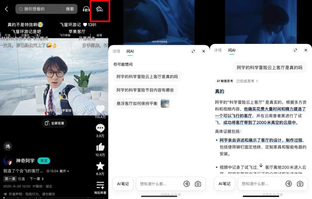 面对一条10分钟甚至30分钟以上的“硬核干货”视频,怎么才能抓住重点?记好笔记?上过网课的人都知道这有多让人头疼。为此,抖音精选贴心地找来了“学习搭子”:AI伴看。“AI章节”功能实现了自动拆分视频段落,一键直达重点;学到卡壳也不用担心,视频右上角的“问问AI”让用户可以随时“举手提问”,不懂的名词、理论现问现学,页面左下角还有“AI笔记”,一键总结全文,妥妥来了个“学霸同桌”。